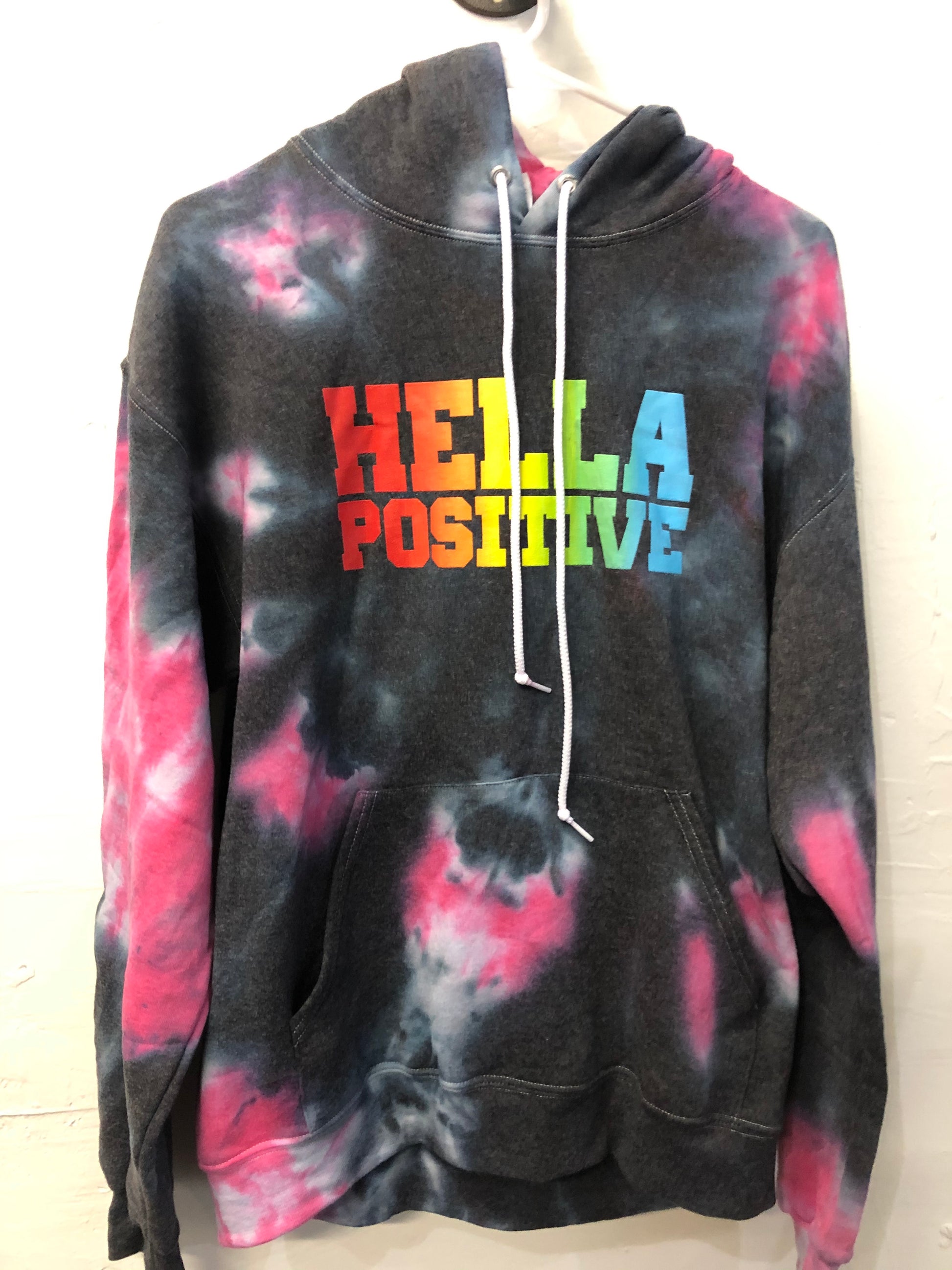 A soft and comfy unisex hoodie that fits all your Tie Dye Hella Positive hoodie needs. Tie Dyed at Hella Positive Headquarters in Oakland, CA by Hella Positive.
