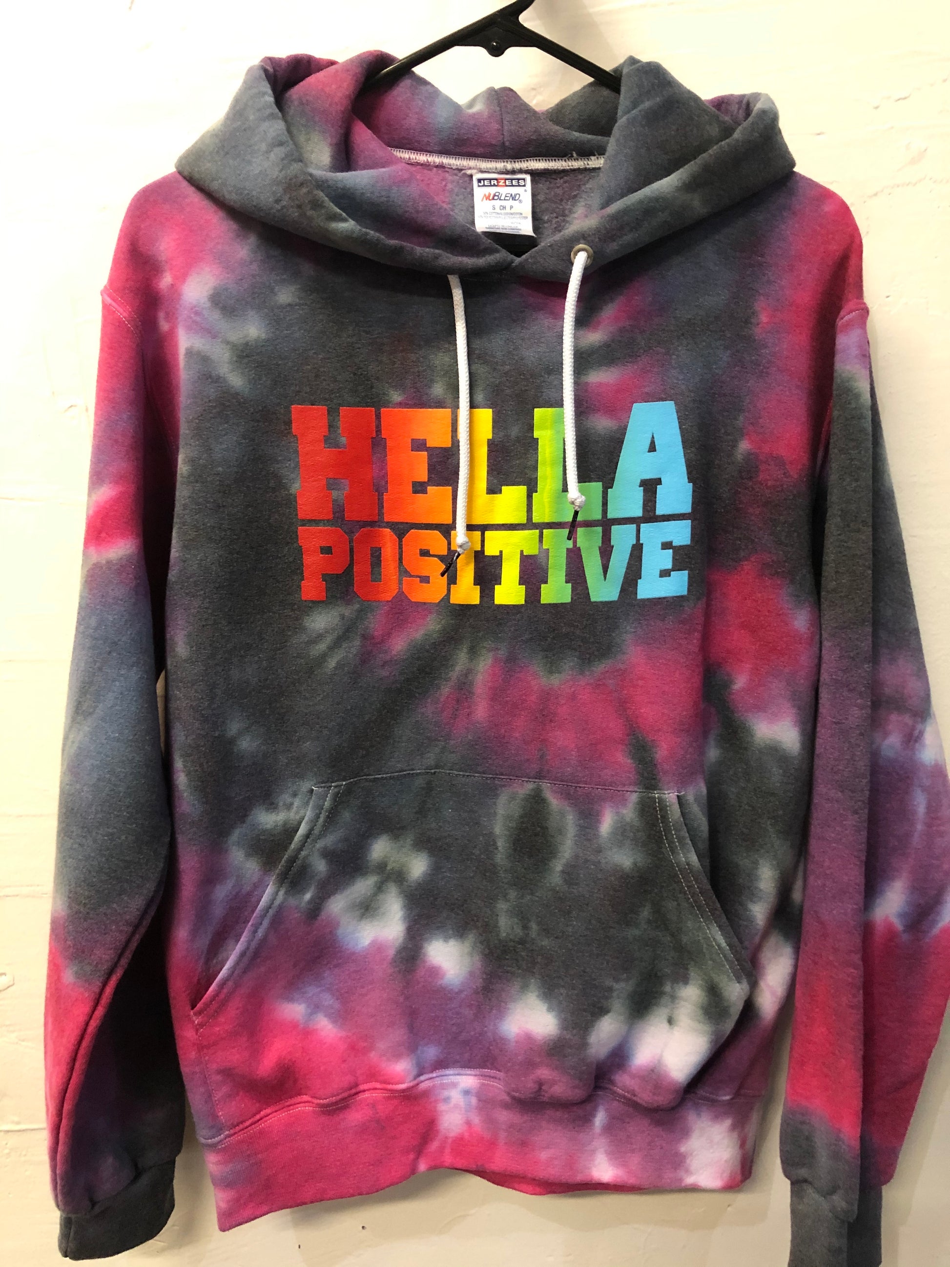 A soft and comfy unisex hoodie that fits all your Tie Dye Hella Positive hoodie needs. Tie Dyed at Hella Positive Headquarters in Oakland, CA by Hella Positive.