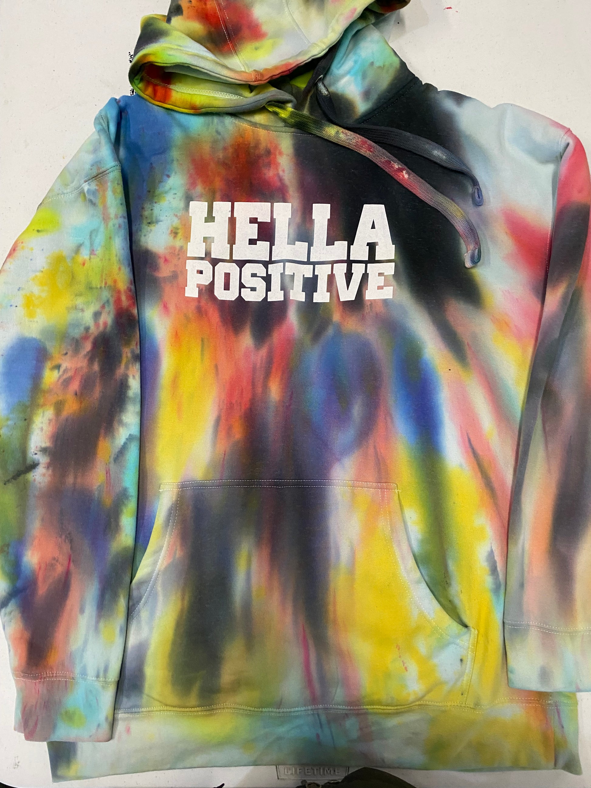 A soft and comfy unisex hoodie that fits all your Tie Dye Hella Positive hoodie needs. Tie Dyed at Hella Positive Headquarters in Oakland, CA by Hella Positive.