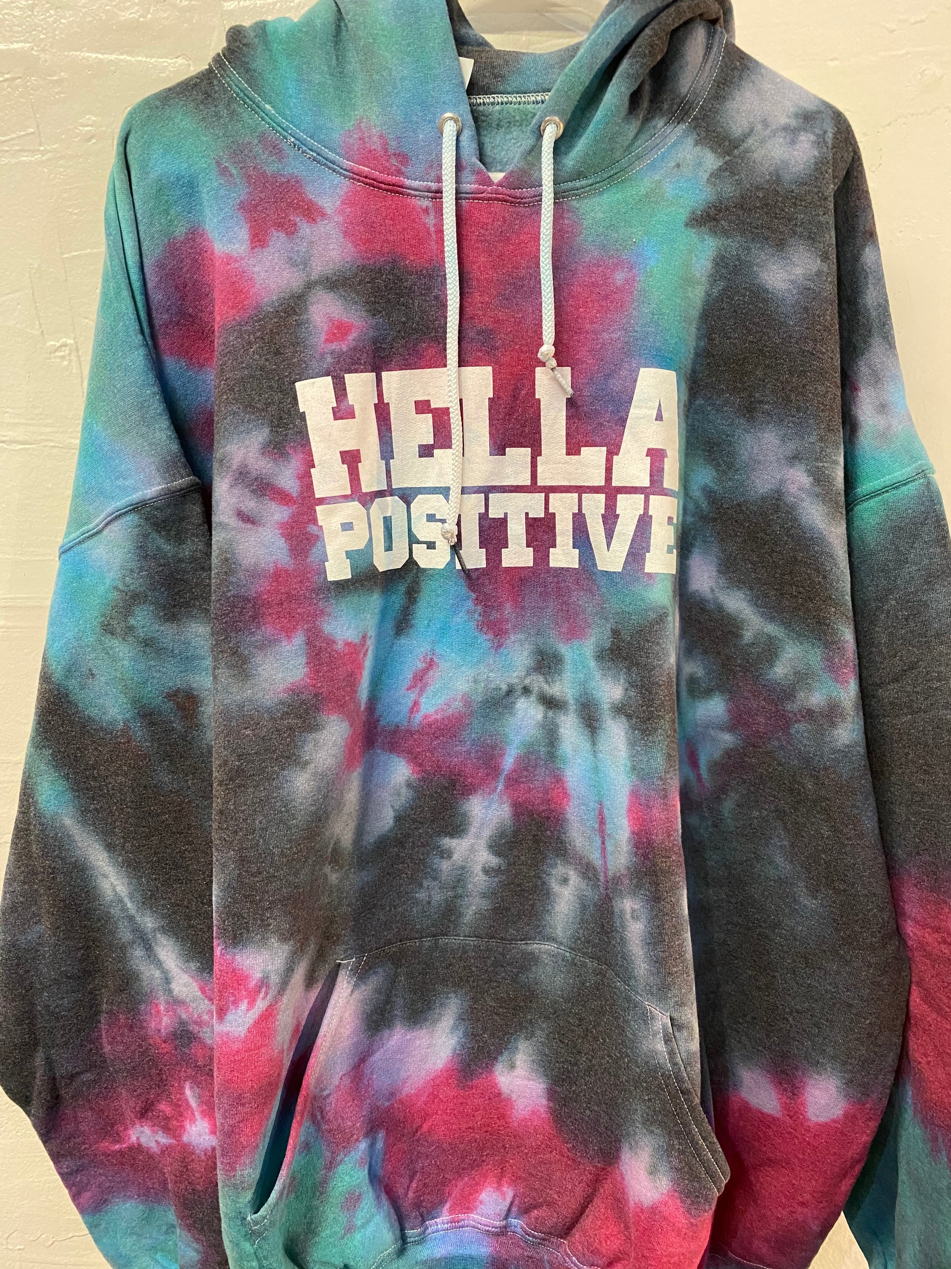 A soft and comfy unisex hoodie that fits all your Tie Dye Hella Positive hoodie needs. Tie Dyed at Hella Positive Headquarters in Oakland, CA by Hella Positive.