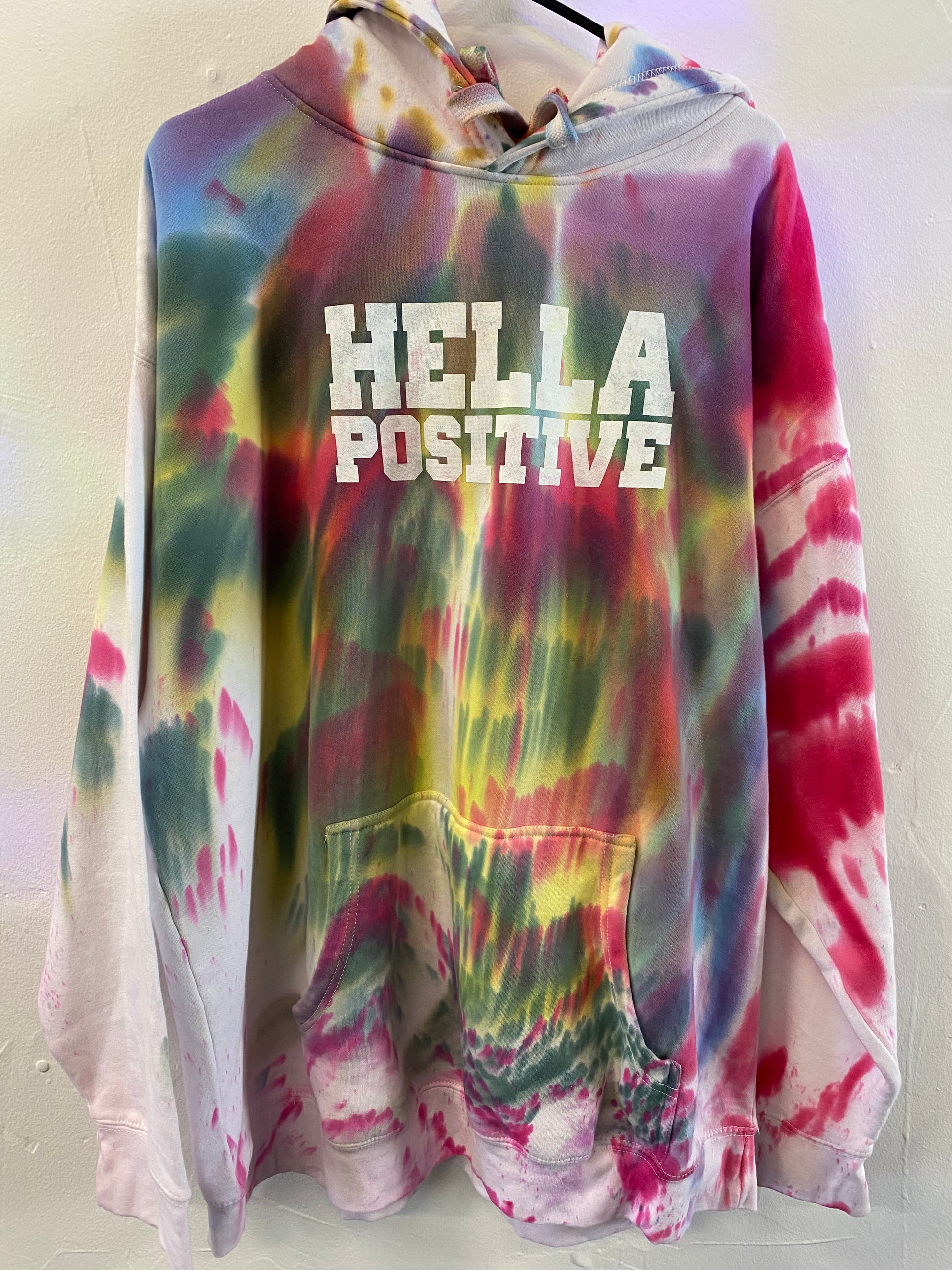 A soft and comfy unisex hoodie that fits all your Tie Dye Hella Positive hoodie needs. Tie Dyed at Hella Positive Headquarters in Oakland, CA by Hella Positive.