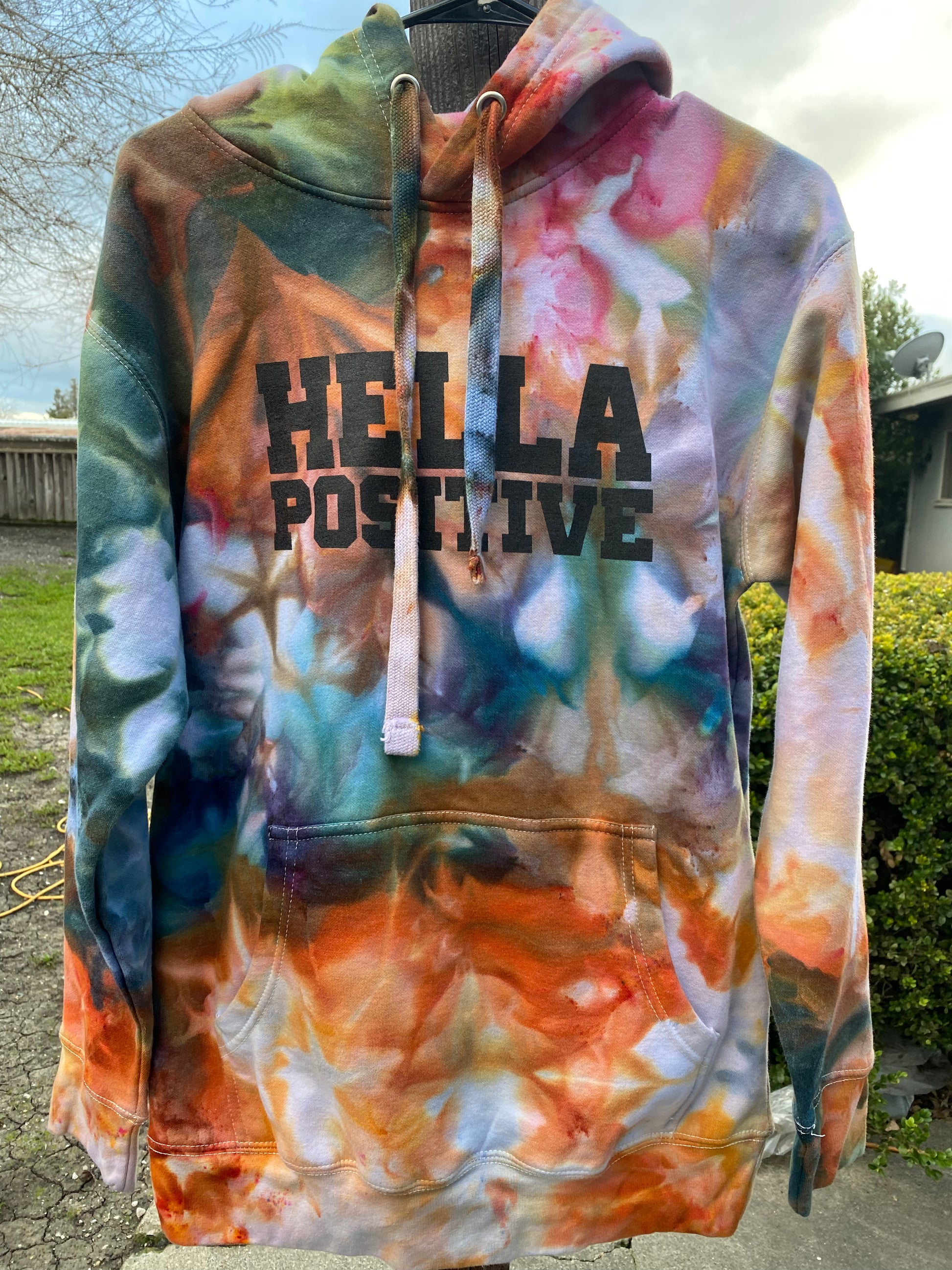 A soft and comfy unisex hoodie that fits all your Tie Dye Hella Positive hoodie needs. Tie Dyed at Hella Positive Headquarters in Oakland, CA by Hella Positive.