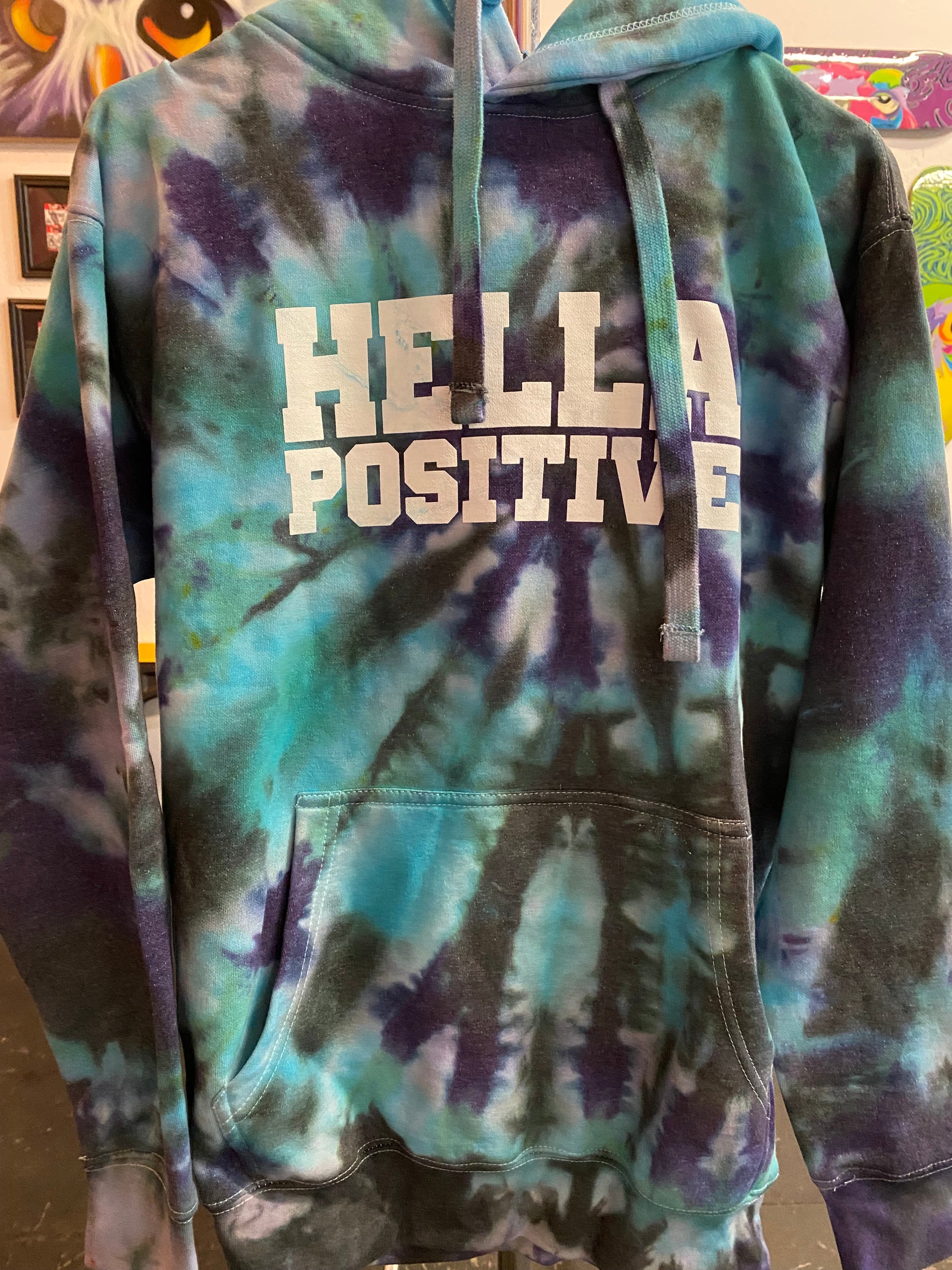 A soft and comfy unisex hoodie that fits all your Tie Dye Hella Positive hoodie needs. Tie Dyed at Hella Positive Headquarters in Oakland, CA by Hella Positive.