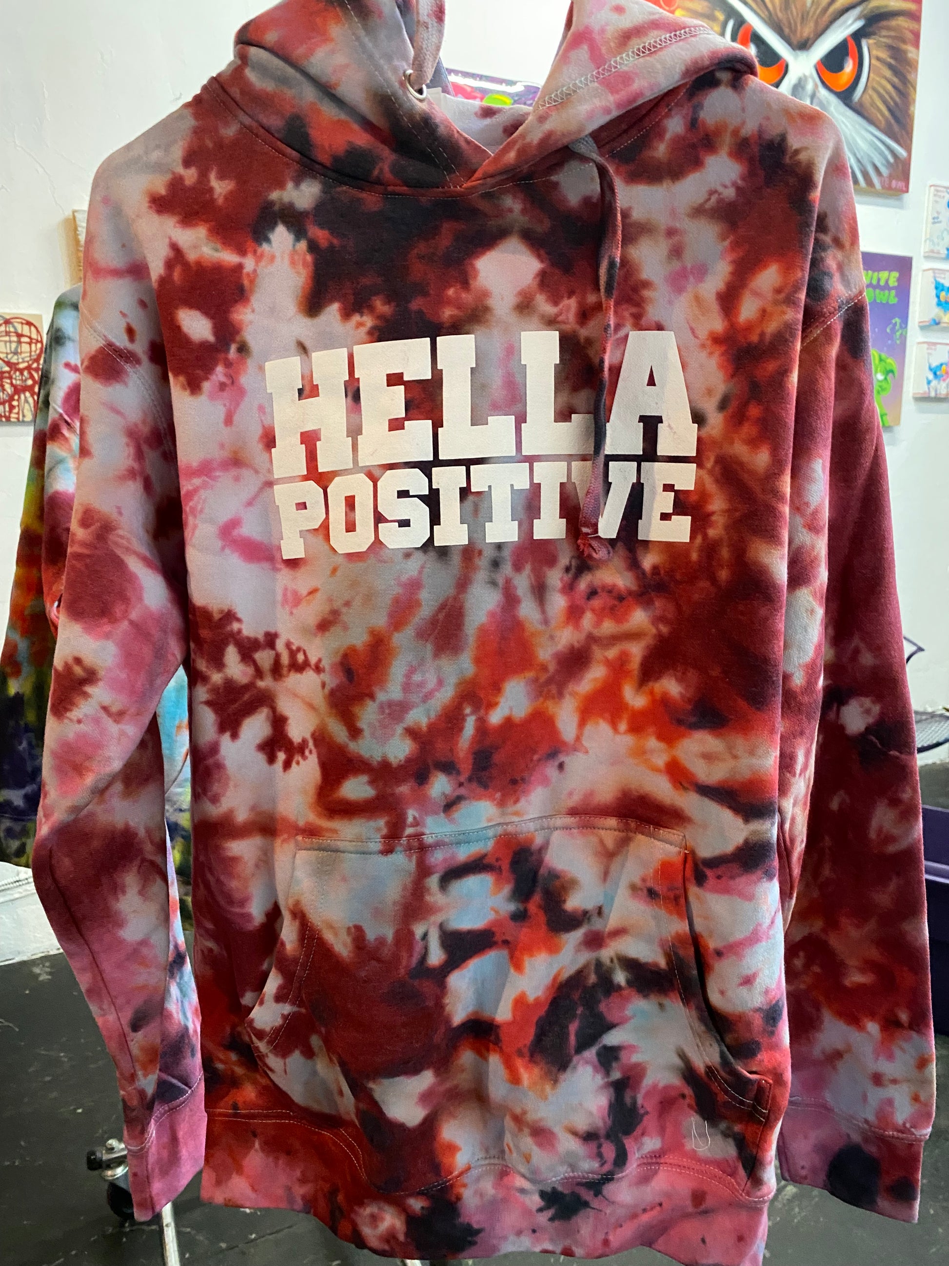 A soft and comfy unisex hoodie that fits all your Tie Dye Hella Positive hoodie needs. Tie Dyed at Hella Positive Headquarters in Oakland, CA by Hella Positive.
