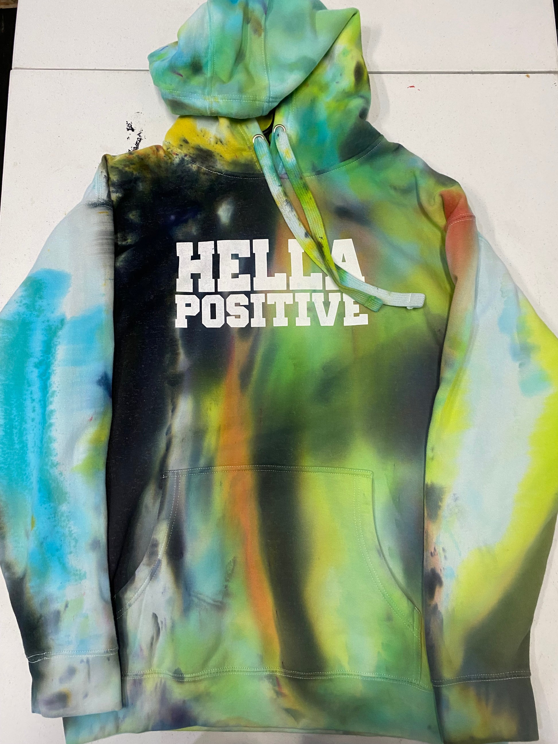 A soft and comfy unisex hoodie that fits all your Tie Dye Hella Positive hoodie needs. Tie Dyed at Hella Positive Headquarters in Oakland, CA by Hella Positive.