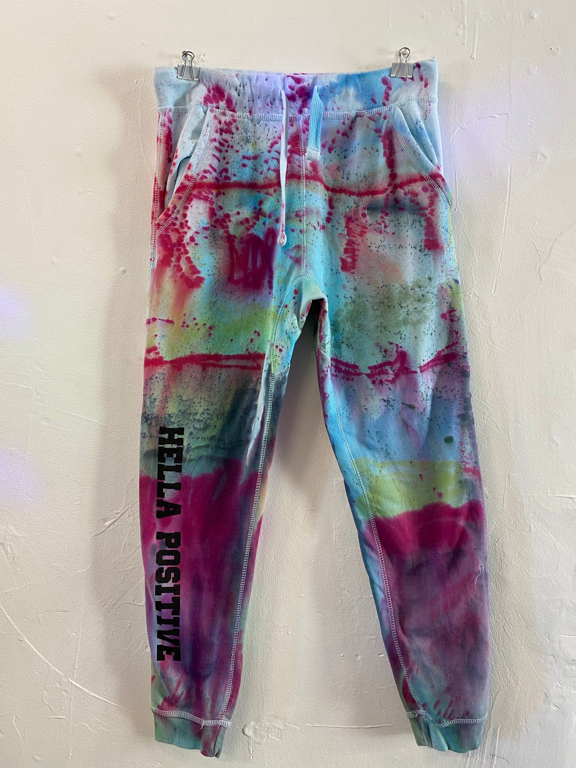 Unisex, ribbed bottom cuff and waistband, tapered fit, flat draw cords, 5-thread stitching, angled side pockets, 1 back pocket. Tie Dyed at Hella Positive.