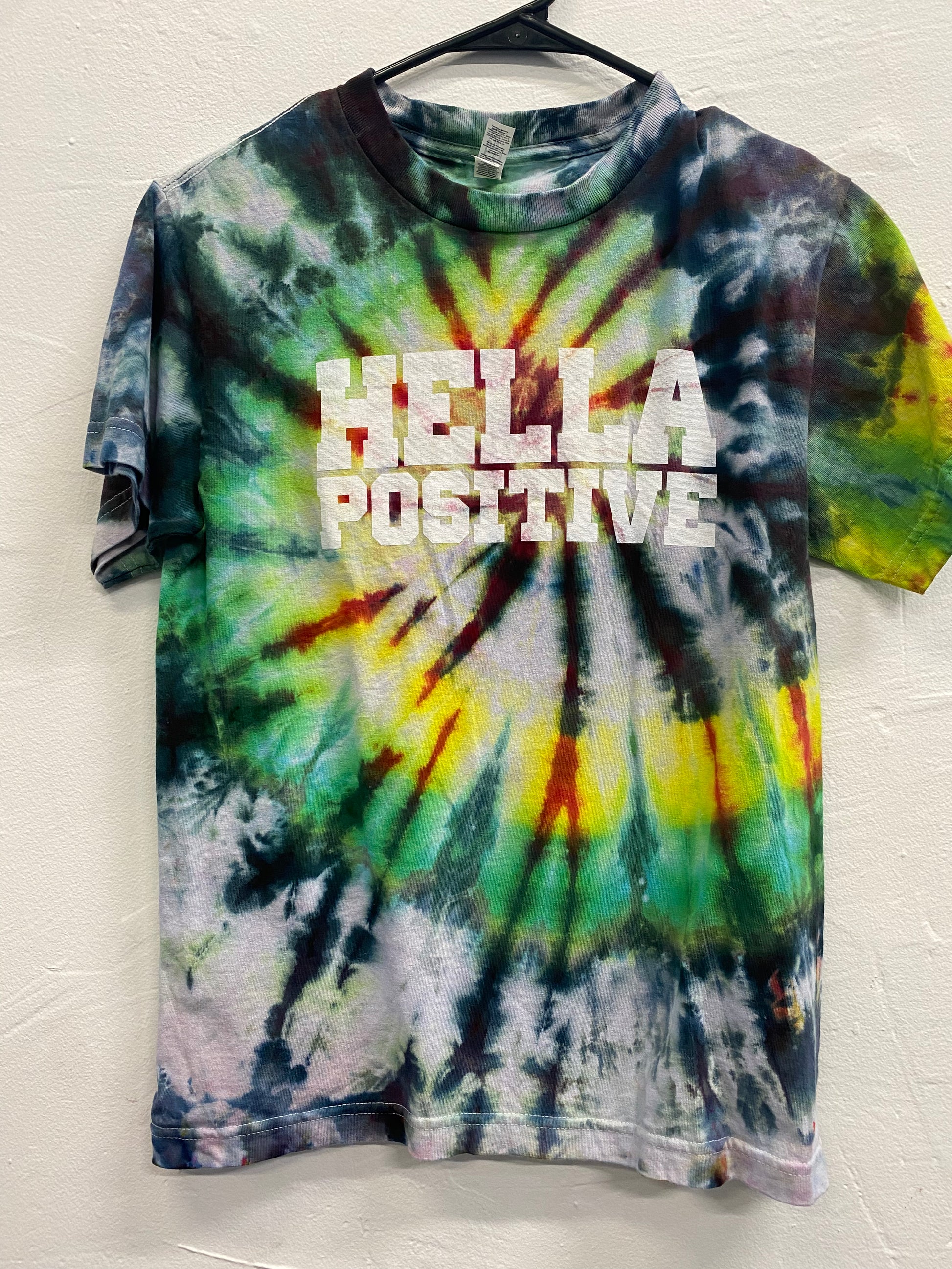 This Hella Positive Tie Dye T Shirt is the ultimate combination of vibrancy and comfort. Featuring a unique tie dye pattern, this t shirt is sure to catch eyes while providing hella positive energy. Get ready to make a statement!